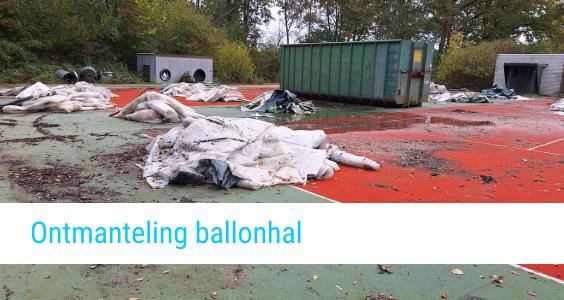 In 2023 hebben wij met enige ceremonie de tennisballonhal laten “inslapen”. Jarenlang werd deze hal door leden en niet-leden gebruikt om in de winter onder goede omstandigheden te kunnen tennissen. Sinds de sluiting lag de halhuid, samen met twee lagen noppenfolie en een plastic afdekfolie, plat op de voormalige tennisvloer. Om dit op te ruimen is contact gezocht met een sloopbedrijf, maar hun voorgestelde methode zou leiden tot hoge kosten voor verwerking via een verbrandingsoven. Een creatieve geest binnen de accommodatiegroep kwam met een alternatief. Samen met vrijwilligers van de groep zijn de halhuid en plastic lagen verkleind, zodat deze materialen via containers konden worden afgevoerd. Dit opruimwerk is inmiddels voltooid. Wat nog resteert, is het verwijderen van het tapijt. Daarna blijft alleen de asfaltvloer met betonnen randfundering over. Deze laten we voorlopig ongemoeid, mogelijk in afwachting van toekomstige ontwikkelingen. Concrete plannen daarvoor zijn er nog niet. |